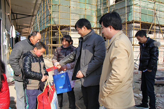 ??? 2013年12月21日,e萬(wàn)行動(dòng)資助人江蘇海外集團(tuán)國(guó)際技術(shù)工程有限公司代表赴江蘇省泗洪縣探訪其資助的12名孩子并為孩子們送去新年禮物。