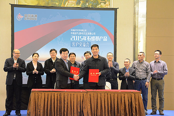 ????????2015年12月16日,中國(guó)海洋石油總公司全資二級(jí)公司---中海油氣開(kāi)發(fā)利用公司在南京漢府飯店召開(kāi)2015年石蠟基產(chǎn)品客戶(hù)交流會(huì)。應(yīng)中海油氣開(kāi)發(fā)利用公司總經(jīng)理朱玉明,中海油氣開(kāi)發(fā)利用公司副總經(jīng)兼中海油氣(泰州)石化有限公司總經(jīng)理夏強(qiáng)斌的邀請(qǐng),我司董事長(zhǎng)林敏、副總經(jīng)理李明及石化部相關(guān)業(yè)務(wù)人員出席交流會(huì)。