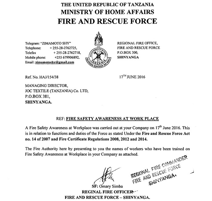 ????????6月19日下午14:00點(diǎn),當(dāng)?shù)叵谰峙嘤?xùn)官Edward Lukuba先生與Hanafi Mkilindi先生在培訓(xùn)室,對(duì)全體中國員工與坦桑員工進(jìn)行了消防理論培訓(xùn),對(duì)滅火常識(shí)、滅火器消防栓的使用方法、疏散逃生、應(yīng)急處置程序等進(jìn)行了說明。培訓(xùn)官針對(duì)紡織廠情況,針對(duì)失火時(shí)應(yīng)如何報(bào)警,在消防員來到之前應(yīng)怎樣斷電,如何隔離危險(xiǎn)品,控制火勢(shì)蔓延,疏散員工到車間外空地等問題進(jìn)行了詳細(xì)的說明,并在培訓(xùn)后以問答的形式檢測(cè)和加強(qiáng)培訓(xùn)內(nèi)容。