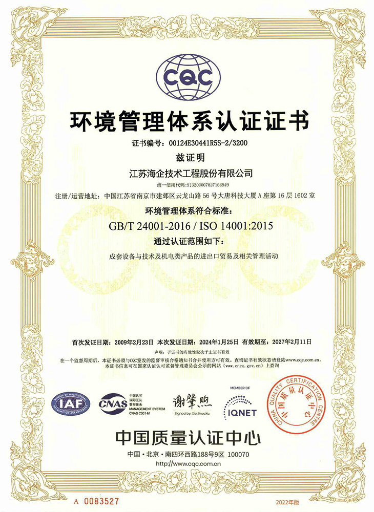 環(huán)境管理體系認證證書